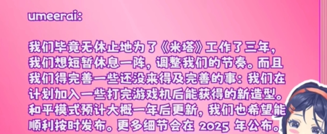 米塔开发者有个大爆料:他们打算近期休息一阵子。等休息结束回来,就会接着对米塔进行完善,还会给米塔设计一些全新的造型。