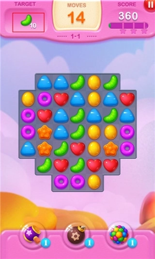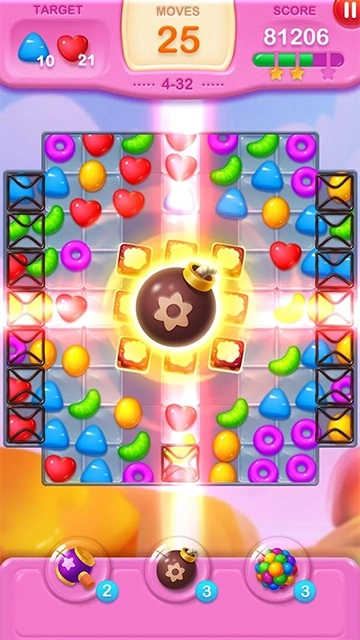 3、道具能够助力玩家更顺利地达成关卡目标,像糖果炸弹就可以炸掉周边的一片糖果。