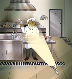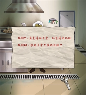 3、进入后厨后,点击洗手台进行呕吐,地面会出现纸条,点击地上新出现的纸条,获取新规则后,将笔拖至墙上悬挂的账本处,再把画好的账本拖给厨师。