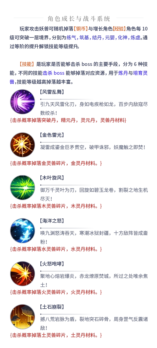 玩家在攻击妖兽时,有机会随机获取铜币与经验;每提升10级,便能突破练气、筑基等不同境界,而等级的提升还能解锁技能使用的限制。游戏内的6种技能是击杀毒boss的核心所在,毒boss掉落的丹药、材料等资源,既可以直接挂售,也能炼丹后再挂售,或者用于培育灵兽来获取长期收益。不过技能的使用存在次数限制,同时还会消耗体力,若开通年卡,则能增加每日每个技能的可使用次数。