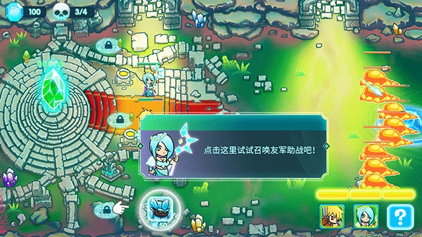 击败敌人能够得到召唤币,利用召唤币可以提升水晶等级、召唤英雄以及获得友军的支援。