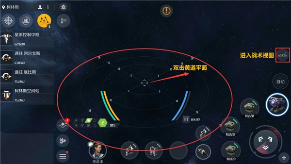 第二种自由飞行的操控方式和RTS游戏有些相似,先点击屏幕右侧的战术视图按钮切换到上帝视角,这时摄像机会自动拉远,屏幕正中间还会出现一个黄道环。