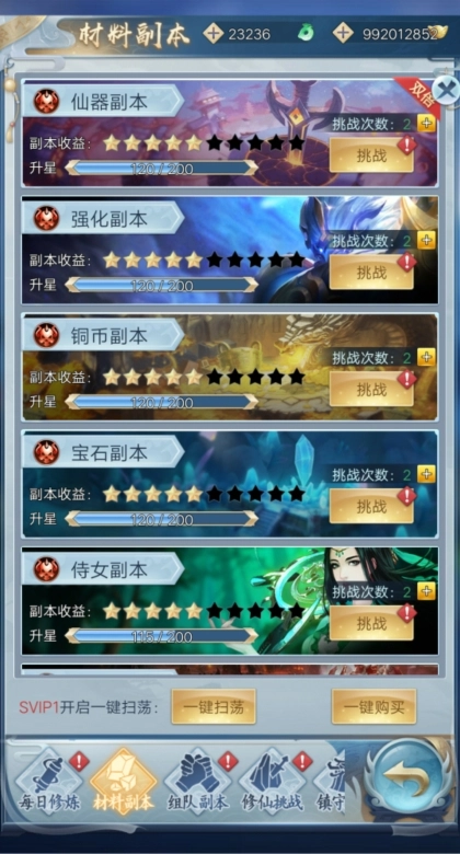 材料副本,从名字就能知道是用来获取材料的副本,是每天都得完成的任务哦。每天有2次免费挑战机会,要是想拿到更多材料,也能用元宝额外买挑战次数,每天最多能多买3次!开通SVIP之后,还可以一键扫荡,既节省时间又不用费力气,简直太棒啦~