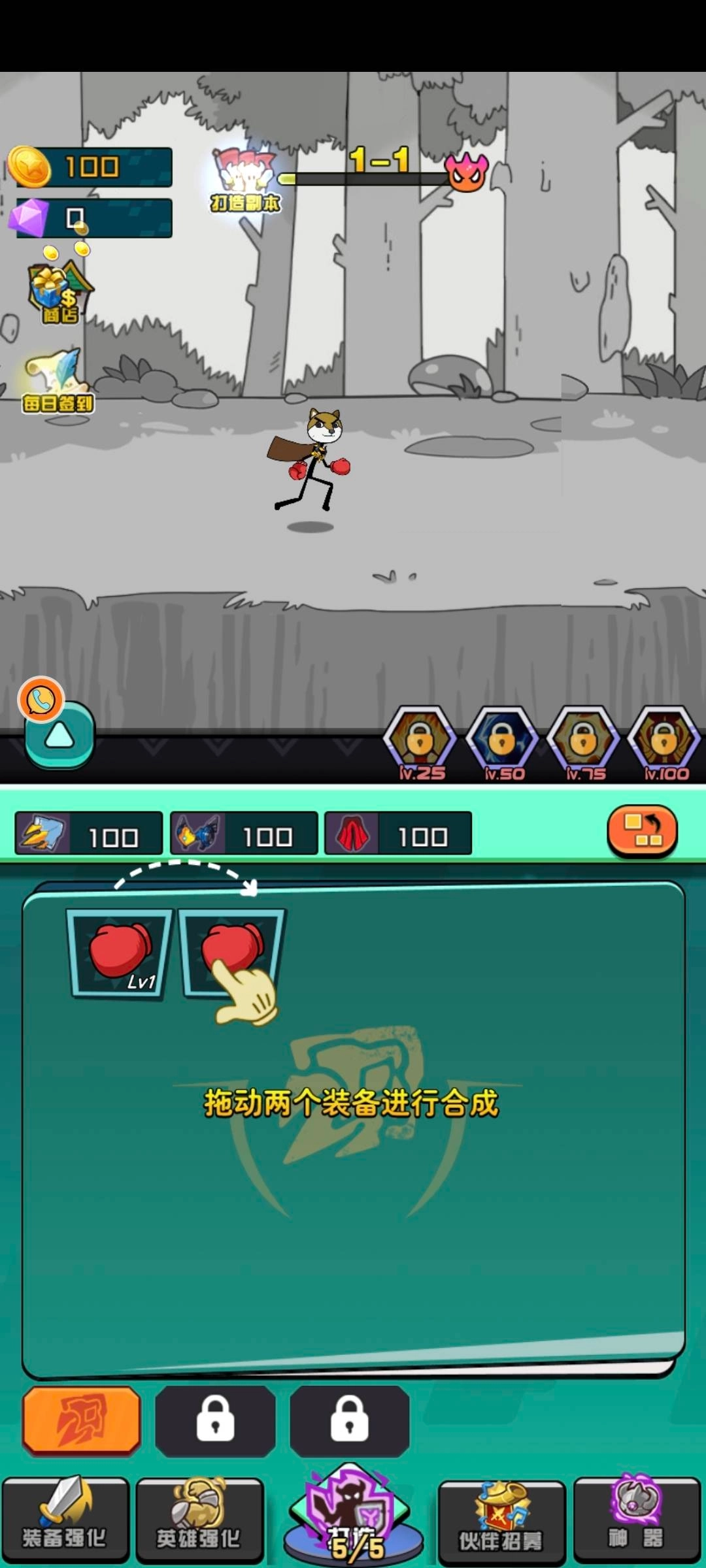 3、把这两个拳套合成到一起,就能释放出翻倍的威力!快拖动装备来完成合成吧!