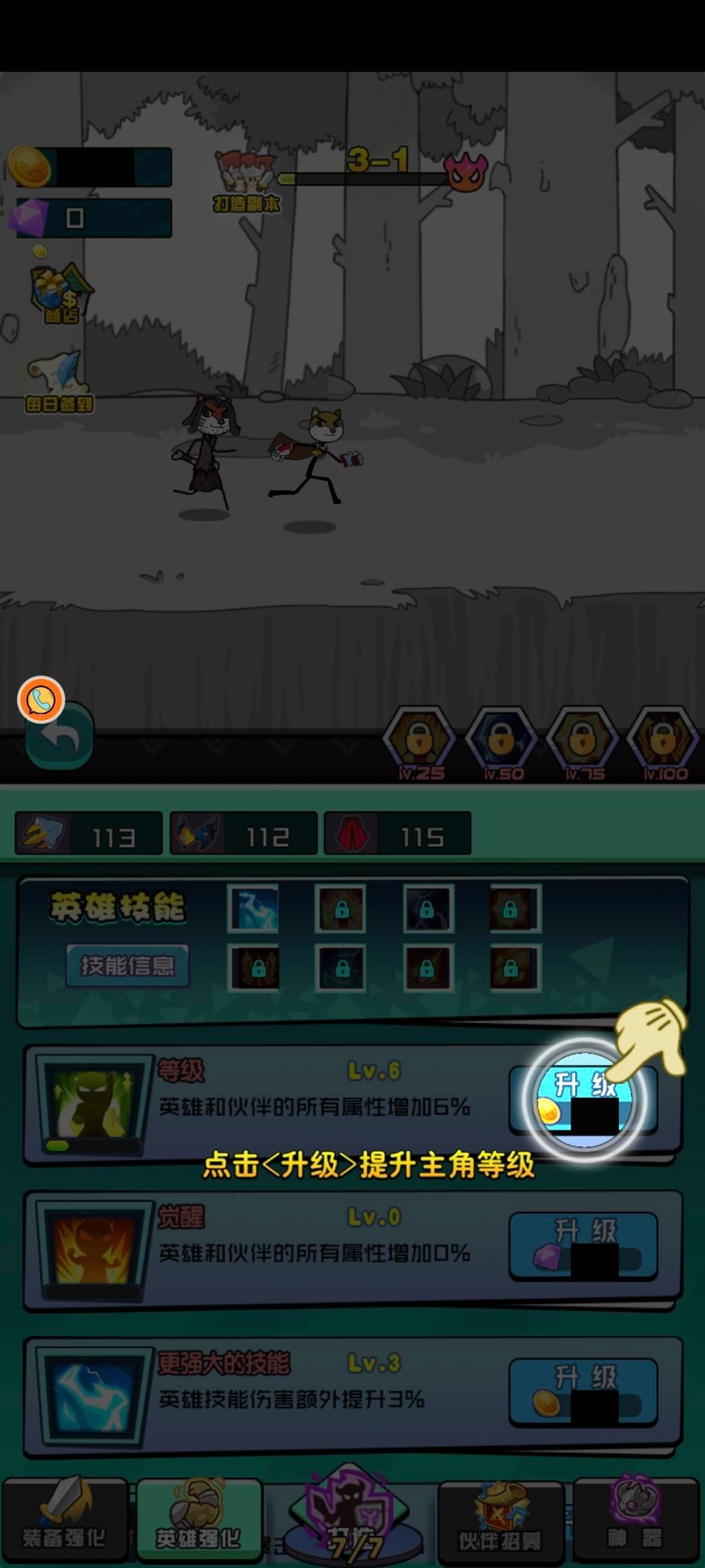 5、点击升级提升伙伴战斗力!