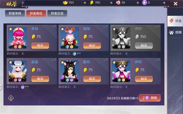 玩家可在妖鉴商店用金色妖石兑换所需妖鉴,若当前没有想要的,可通过刷新获取更多可选的妖鉴。