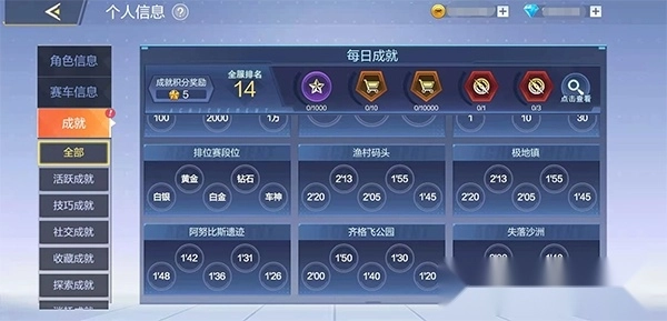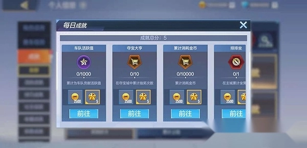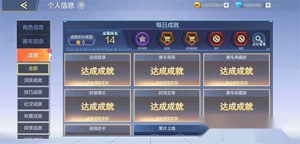 每日成就:赛车手们可以通过日常行为来达成每日成就的要求,从而获得对应奖励,金币以及成就积分;