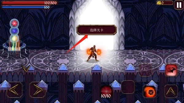 1、进入游戏后,点击左下角控制方向的左右按键,操控巫师移动到有光的位置,然后点击选择关卡。