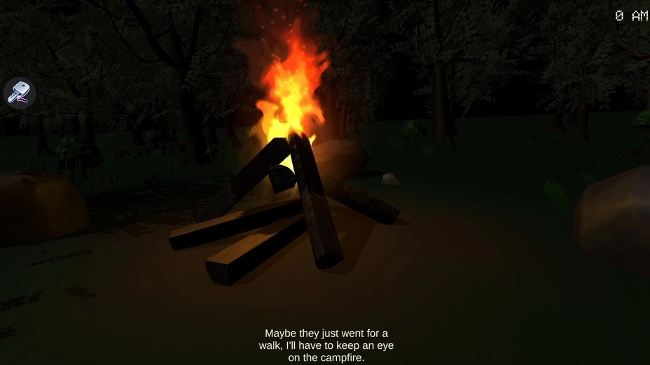 你和朋友们在森林徒步时,傍晚迷了路,于是生起一堆篝火。可篝火燃着燃着,你却睡着了,等醒来时朋友们都没了气息——是被人杀害的!现在那凶手正盯着你!千万当心,别让篝火熄灭,一旦火灭,他就会发起攻击!你已经发出求救信号,但救援要很久才能到,至少需要五晚才会找到你!这期间,你每晚都得小心护住篝火,还得四处找树枝添柴让火一直烧着!你能撑过这五个夜晚吗?
