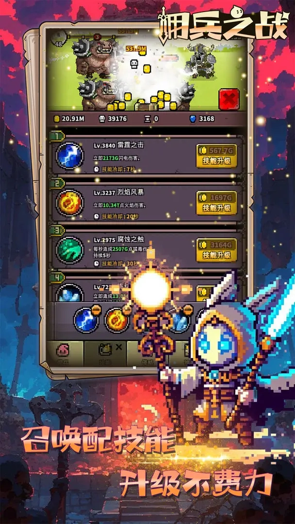 养成系统由佣兵、技能和神器三个核心部分构成。佣兵的战斗力提升依赖于持续的更新迭代与招募机制,其数值表现清晰直观,更新节奏相对较快,同时招募环节中还存在着品级划分与随机携带技能的设定。佣兵的培养无需追求过高等级,关键在于考量升级带来的战力提升效率,毕竟兵种的强化并非越多越好、等级越高越好。这一点,正是该游戏与其他放置类游戏最显著的区别所在。
