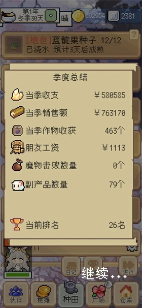 点击摆摊功能,然后在下方选项里选择“全部”,接着按照价格进行排序,优先把价格高的物品卖掉。需要注意的是,尽量不要出售秘石这类矿物,前期用不上的武器和魔药可以优先处理掉。完成这些操作后,你手里的金币大概能有1到2万,毕竟开局会赠送1万金币。至于种植方面,可以根据公告栏的需求来决定种什么。