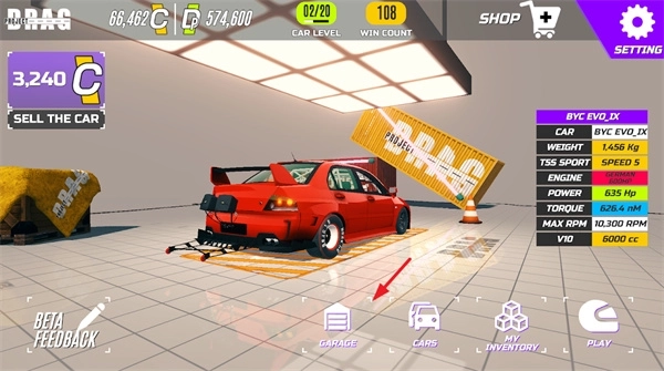 1、进入主界面后,点击下方的CARAGE选项,即可进入车库页面。
