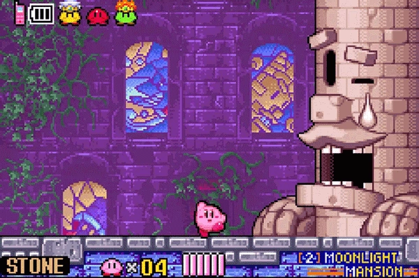 对付它的最佳办法:先吸掉它的冰块,再把冰块吐回去反击。你操控的卡比,每次和敌人相撞或者被敌人的攻击击中,剩余的健康值都会减少1点;一旦健康值降到0,生命值就会扣除1点。