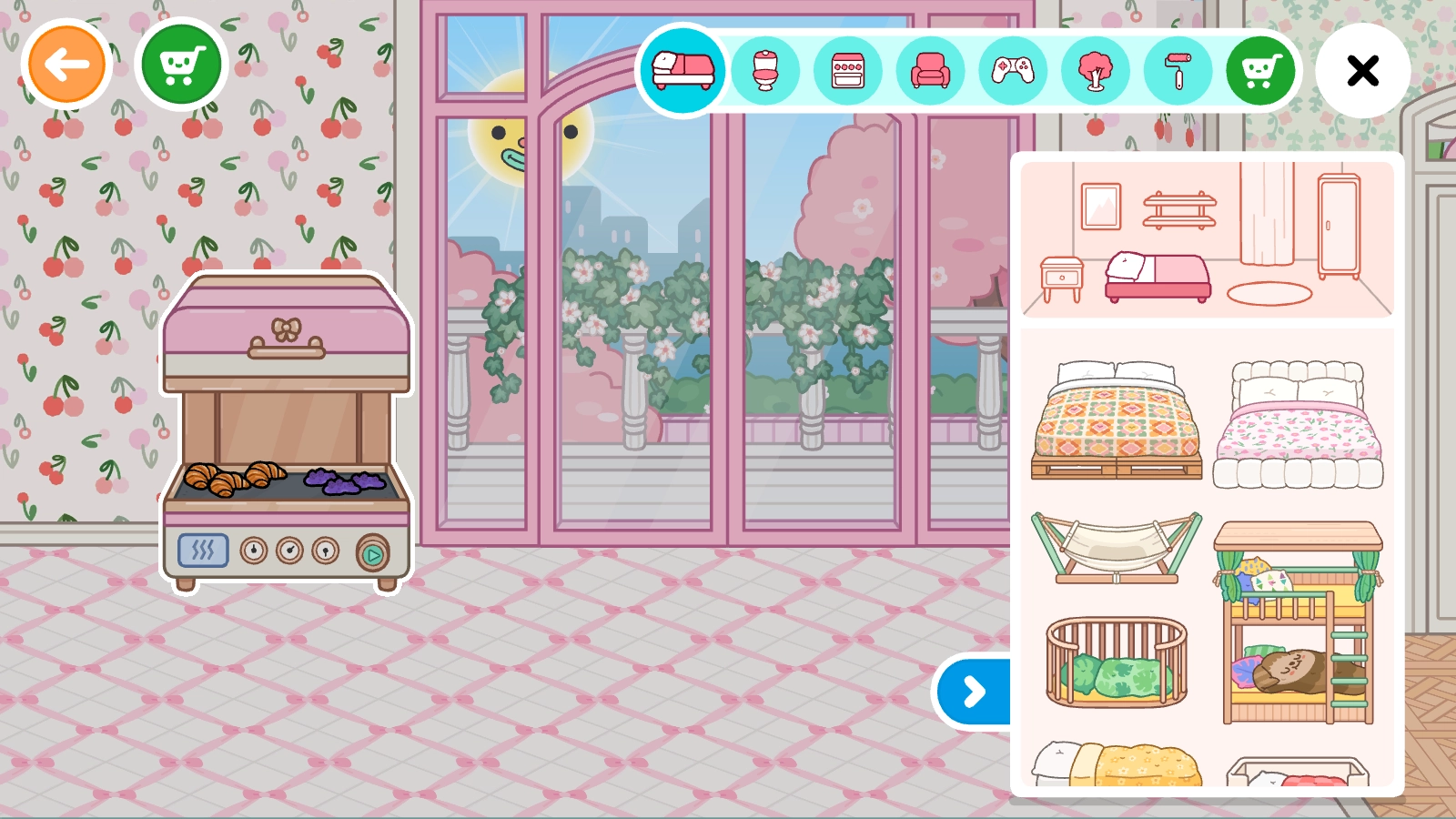 点击就能进入,接着点击右上角就能对屋内进行装修和家具布置了。