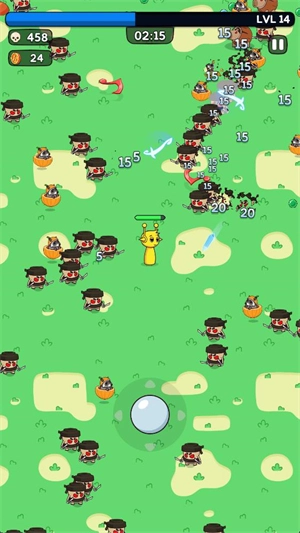 角色会自动攻击周围的敌人,击败敌人会掉落经验球。