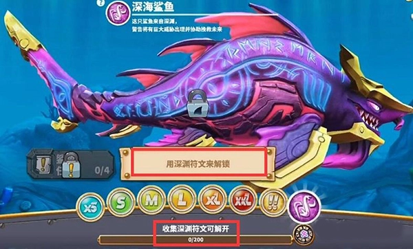 1、深海鲨鱼通过深渊符文来解锁,需要搜集200个深渊符文。这些符文通常刷新在珊瑚旁,基本上每个珊瑚都会刷新符文,而且每开一局刷新一次,还是比较好肝的。