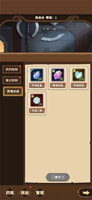 炼金功能分为三种:药剂炼制,徽记炼制,灵魂合成。