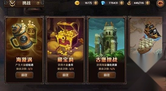 3.挑战副本:丰富多样的玩法,能为各位海盗带来充实的日常乐趣。在探索加勒比海的旅程中,别忘了去藏宝洞和古堡挑战一番,说不定会有意外的奇遇哦!不过要记住,有财宝的地方往往伴随着战斗!海盗之间的战斗向来激烈又震撼,大海战更是各位海盗绝对不能错过的精彩玩法之一!
