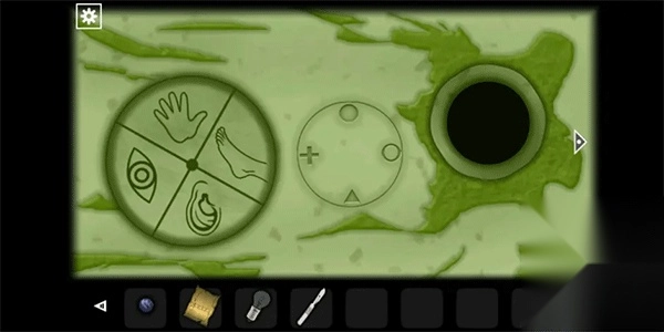 4. 画面衔接的场景呈现出一种极为诡异的解谜场景风格,包含寻找钥匙、符号密码等元素。