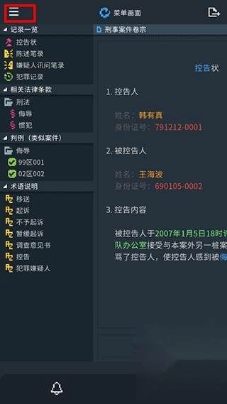 5、左侧列表包含各类记录、相关法律条款以及一些术语说明,玩家可随时查阅。