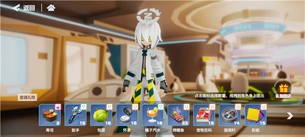 橘子汽水、宠物百科、指南针、彩纸、骑士折纸、玫瑰酥、蔓越莓曲奇、棉花糖、蜂蜜茶、麻婆豆腐、磨牙饼干、自制贺卡、大会员、巧克力、大厅指南、火焰玫瑰、漫画书、哈密瓜、柠檬、新鲜蔬菜、芒果、苦瓜奶茶、炸薯条、西冷牛排、甜甜圈、烤串、棒棒糖、海鲜套餐、牛奶、爱心便当。
