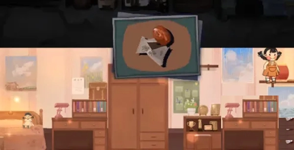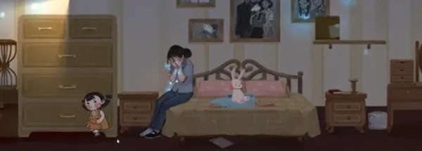 2、从梳妆台爬上去获取兔子玩偶,将其放入中央的礼物盒,进入上方空间继续探索