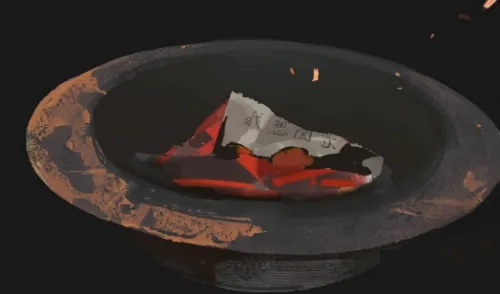6、将之前收集的道具全部焚烧,在棺材上触发关键剧情,火盆中出现一张神秘纸条,随后进入最终阶段