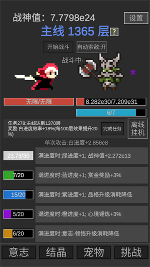 在《战神进度条》里,玩家将化身不死战神,一路感受角色成长变强的畅爽体验。游戏最大的亮点就是简单轻松,新手也能快速上手,就算挂机也能自动升级、提升能力。传统游戏里让人头疼的生命值限制在这里完全不存在——战神拥有无限血量,你可以毫无顾虑地持续战斗,再也不用怕失败。随着战斗推进,经验值会不断累积,你还能解锁更厉害的技能,让战斗效率越来越高,到最后甚至能实现对敌人的秒杀。