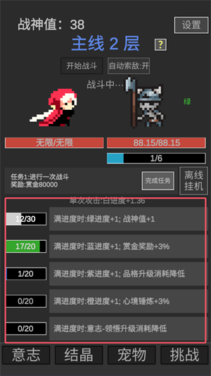 玩家击败敌人后进度条会增长,不同进度条对应的属性加成各有差异。