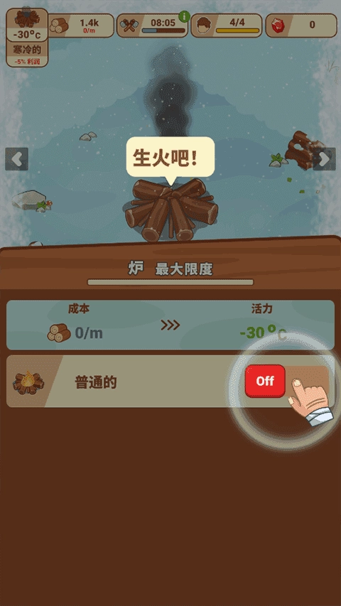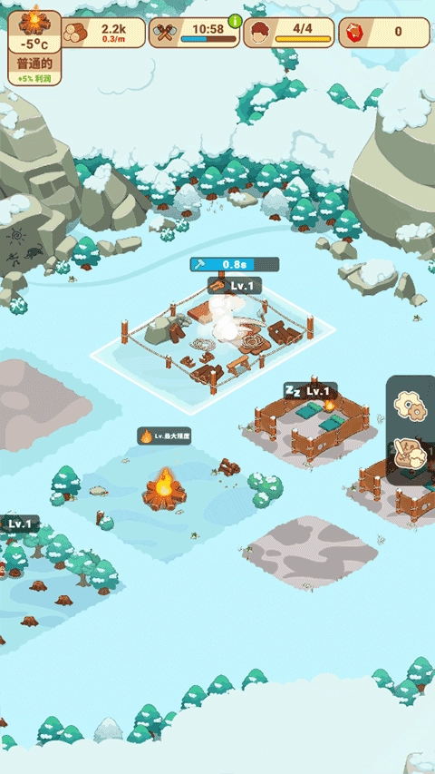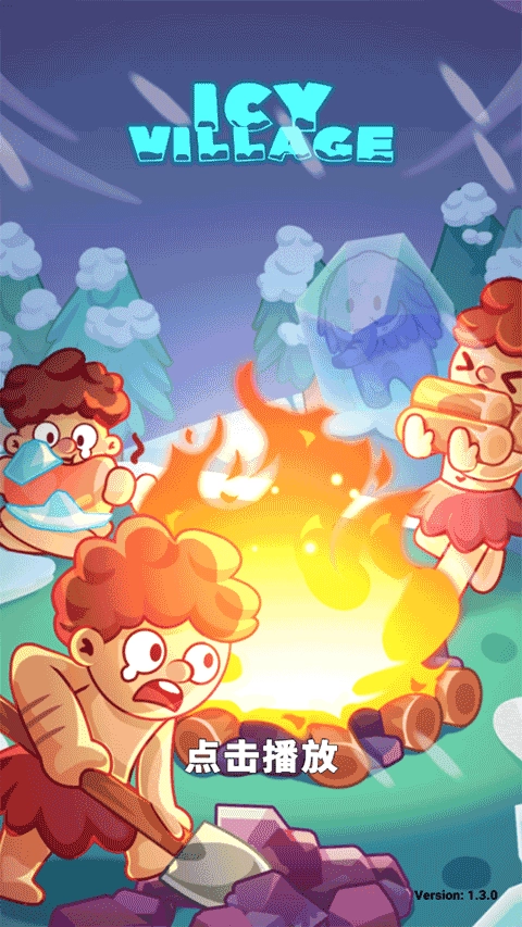 启动冰河时代生存大亨后,轻触“点击播放”进入苍茫雪原。画面渐亮,指尖划过屏幕即可跳过远古图腾叙事,迅速走向中央柴堆,长按引燃温暖火种——这是文明复苏的第一步。