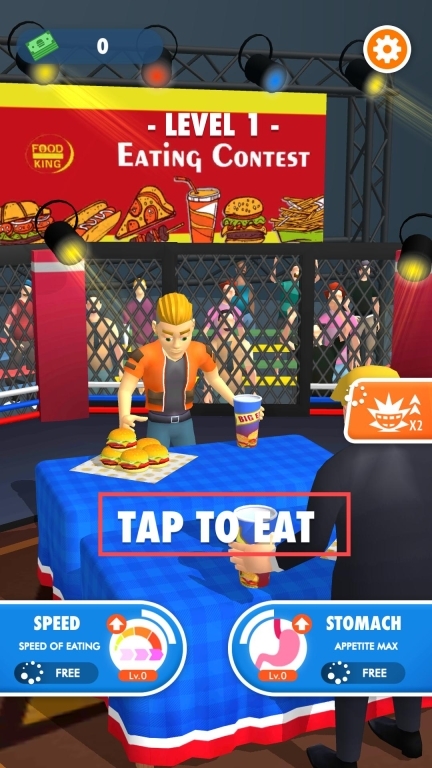 1、点击“TAP TO EAT”即可开启美食竞赛,需要快速点击屏幕来吃汉堡,同时留意下方的速度条和stomach进度条,努力保持领先优势。
