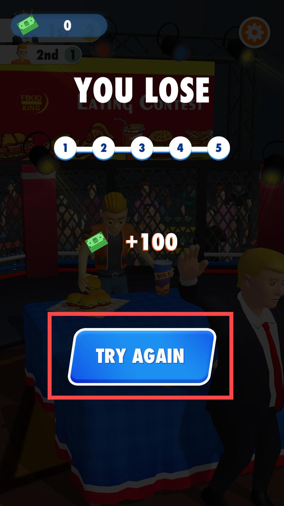 3、要是失败了,就点击TRY AGAIN重新比赛,借助积累的经验来调整节奏,科学分配加速和饮水的时机,这样能提高获胜的可能性。