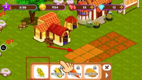 1、打开农场界面后,底部会显示种子栏,从中挑选可以种植的种子,点击选中的种子并将其栽种到农田中,即可启动农作物的种植流程,为之后的收获环节做好前期准备。