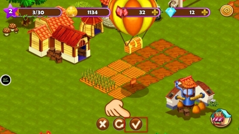 4、在完成建筑放置之类的操作后,界面下方会弹出确认按钮,点击该按钮即可确认相关操作,使建筑或种植等设置正式生效,从而推动农场建设进程。