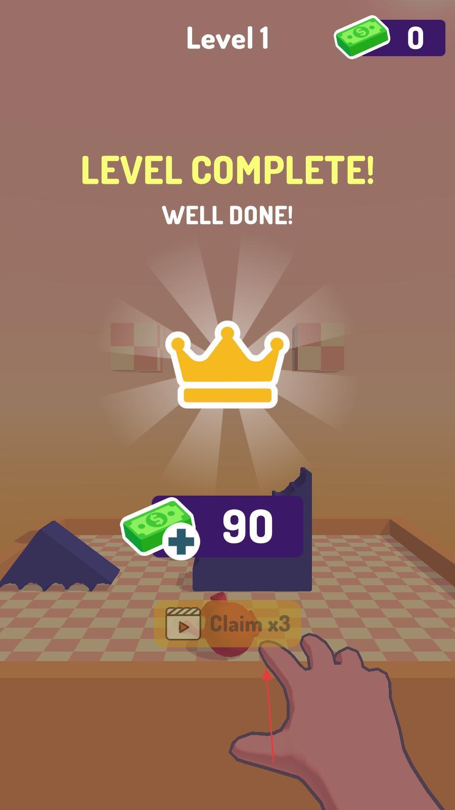 2、成功通过第一关后,界面会显示关卡已完成,同时获得皇冠和90货币的奖励,点击对应的按钮,即可领取奖励并为进入下一关做准备。