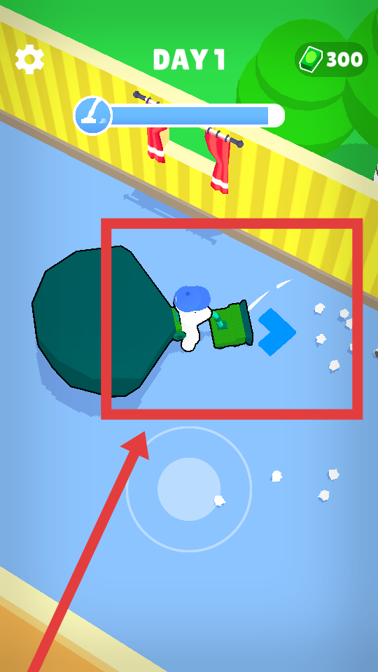 3、通过摇杆操控方向,使角色拖拽着垃圾袋,将垃圾运送至指定地点,从而完成第一天的清洁任务。