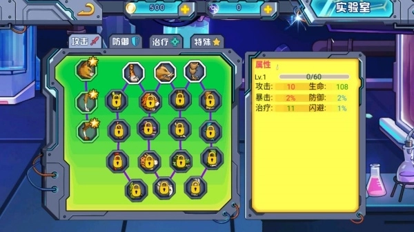 1、解锁攻击型技能和基础配件,能快速增强宠物的输出能力,这样就能在低难度对战里积累金币和进化资源了。