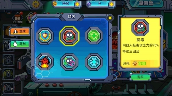2、带着战斗赢来的金币去商店,解锁技能、药剂之类的道具,给宠物配上好用的装备。