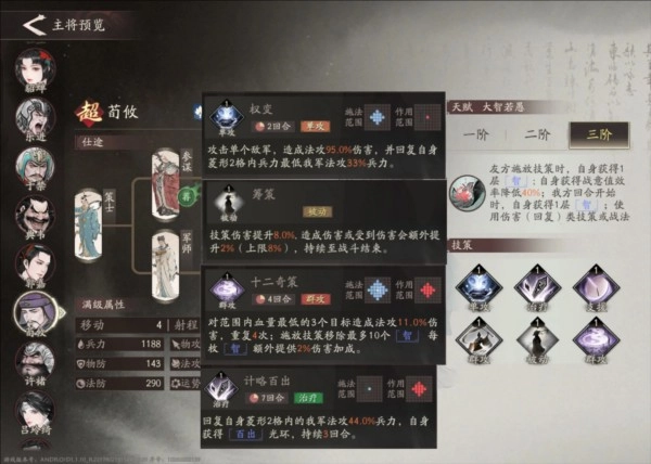 常规流:前期推荐权变和抚宁内外。后期加上十二奇策作为爆发。放弃抚宁内外的原因是都是减少技能CD类技能,综合来说计略百出的群体增益对『智』的叠加更有帮助。如果队友的技能cd大多不超过2回合,则可把计略百出换成筹策来追求更高输出,带权变的原因是普攻是无法消耗【智】的,必须带有短CD的技能来保证输出。