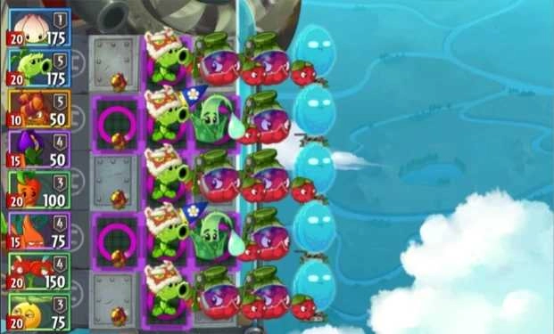 第二排种植豌豆射手,第三排布置导向蓟,这些植物足以应对前期来袭的僵尸。接着在天空瓷砖上栽种飞行类植物,比如旋转芜菁、旋涡枇杷、芦笋战机等。该关卡没有特殊难点,玩家只要充分运用旋转芜菁和旋涡枇杷,就能顺利通关。