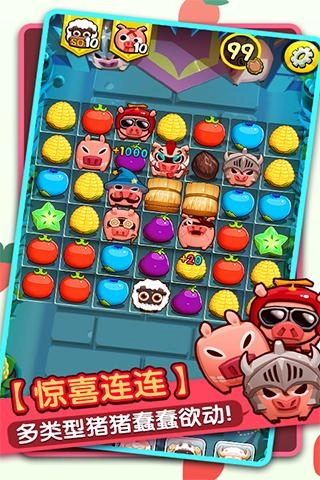 类似多数三消游戏,《消灭猪猪》要求玩家通过拖动调整角色位置,使三个或以上相同元素连成一线后消除,并根据消除次数和数量获得积分。