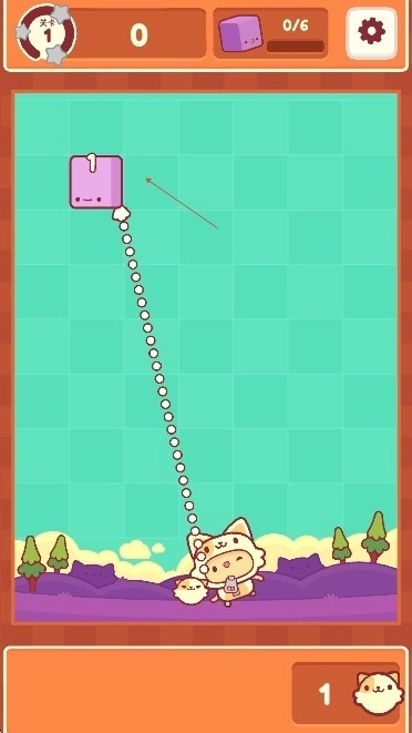 3、玩家需要用手指在屏幕上滑动,把瞄准线移向方块所在的方向,接着顺着该方向向上推动瞄准线,发射皮皮球将方块打碎就可以了。