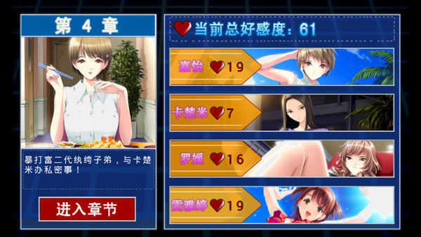 2、每一章结束之际,若四位女主角的好感度总和满足规定条件,即可开启下一章的内容。