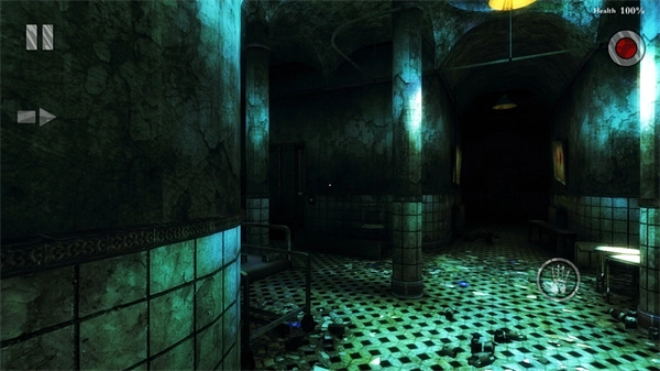 1.玩家身处精神病院内,四周一片黑暗,只能依靠夜视仪发出的微弱绿光来观察周围环境。