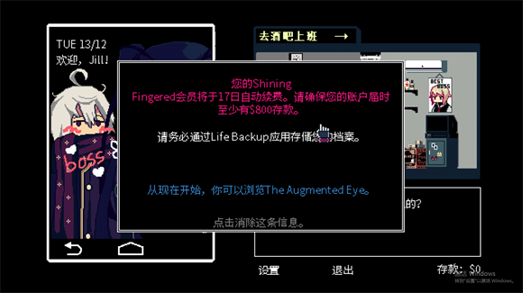 2、工作板块:屏幕右侧区域对应工作功能,在这里能够查看与工作相关的各类信息,还可以选择前往工作(以此度过一天);另外,也能在商店中购买道具(需要注意的是,此处用于购买的钱是Jill个人的积蓄funds,并非酒吧的营业资金)。