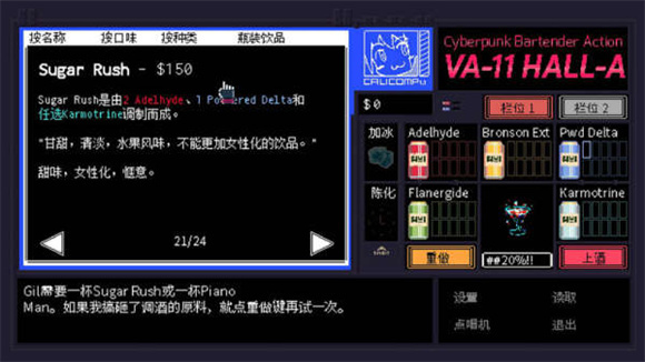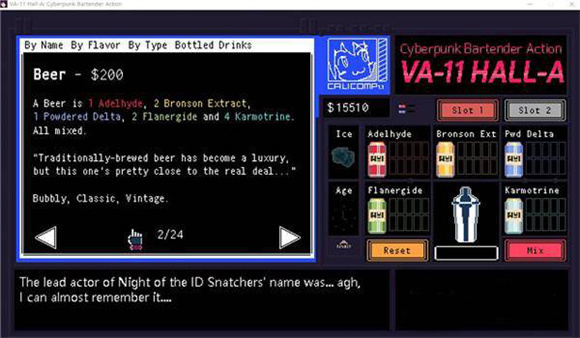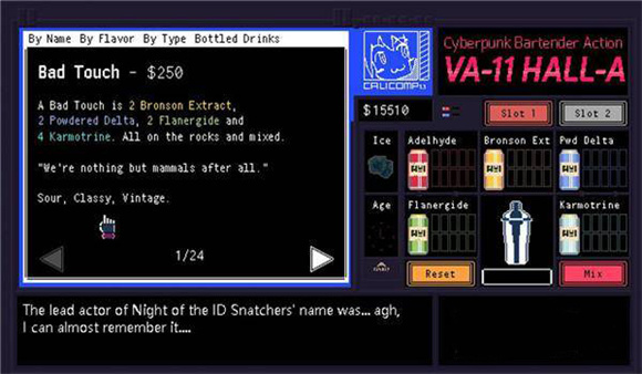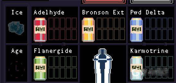 3、调配框:屏幕右侧设有调配框,其中会呈现五种调酒材料(adaelhyde、bronson ext、pwd delta、flanergide、karmotrine)、两种添加物(冰块、age)、两个槽位(1槽、2槽)以及两个操作按钮(重置和混合)。需要特别留意“混合”操作键,初始阶段的混合属于轻度摇晃,5秒钟之后会切换为快速摇晃,部分饮品仅适用于轻度摇晃,因此不能进行快速摇晃操作。
