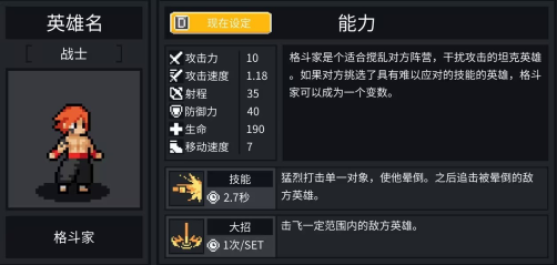 2、格斗家是高攻击、高移速的战士定位,复活后跑图效率很高。尽管拥有190点血量与40点防御,但他并非合格的主T,更偏向于承担控制职责的副C。普通技能是短距离的“颠勺”效果(doge),大招能造成大范围短暂击飞,不过伤害不算突出。他是2v2模式中的“三巨头”之一,但进入3v3和4v4模式后,会逐渐被更优的英雄选择替代。技能冷却时间极短,若搭配稳定的近战输出角色,能发挥不错的效果。这个英雄可以让选手练习,但并非必要选择。