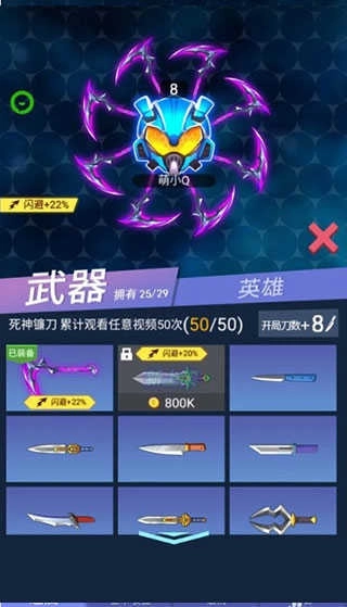 右侧功能栏整合了武器、角色与资源的管理功能,英雄和飞刀会随等级自动解锁,玩家也能通过观看短篇广告免费获得升级机会,等级较高的角色初始拥有的飞刀数量更多,基础属性也更出色。