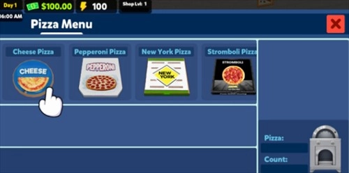 3、在弹出的披萨菜单中提供了不同披萨类型供玩家选择,根据需求点击准备制作的披萨;
