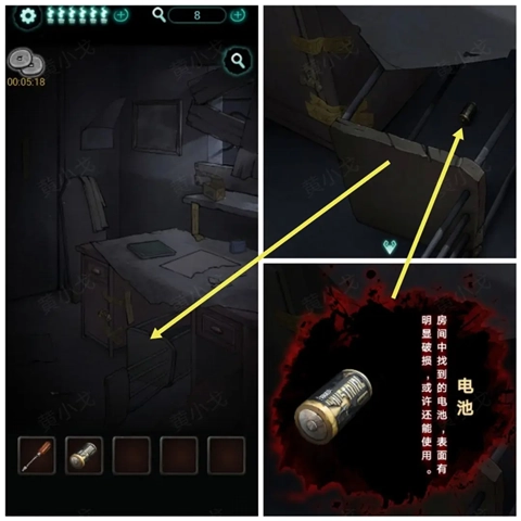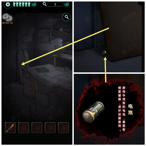 2、点击门旁边的木板,获得【电池】。